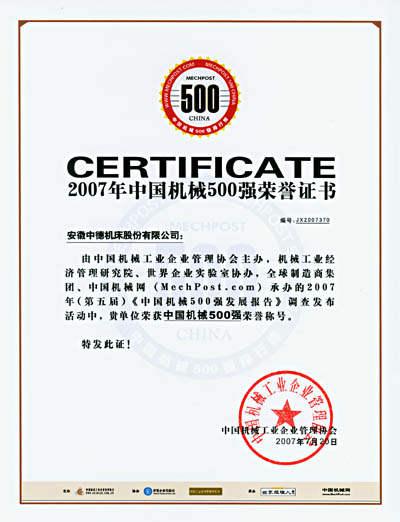 2007年《中国机器500强》暨《天下机器500强》成长报告会7月20在北京国民大礼堂盛大停止,我公司荣获“中国机器