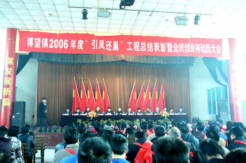 2007年2月26日上午9时,博望镇2006年度“引凤还巢”工程总结惩处和全民创业再带动大会在博望体裁中间盛大停止,当涂县县长操隆山、县委常委、博望镇党委布告张清、镇长刘国宝等列席了大会并作了主要发言。集会对2006年度“引凤还巢”和全民创业两大工程中出现出的各种进步前辈小我、进步前辈小我予以了惩处并对2007年的任务停止了全数的安排。
